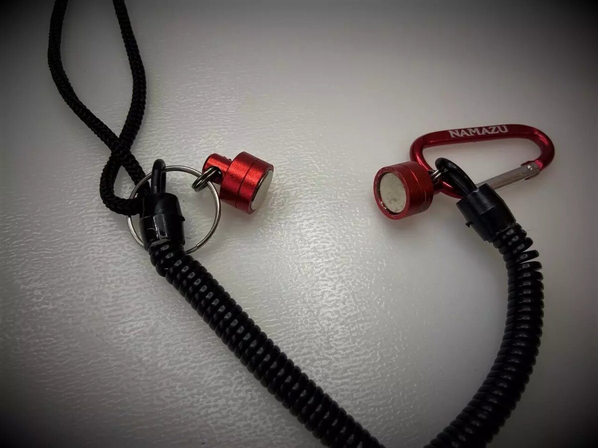 Я уверен, каждый терял на рыбалке какой-нибудь аксессуар: ножницы, экстрактор, зевник, подсак и т.п. Они выпадают, выскальзывают, уплывают, тонут или, как у меня - просто бывают забыты на берегу. Да, недавно я оставил подсак на рыбалке, а пропажу заметил только дома. Пусть он был и не дорогой, но переизбытка денег в своей жизни я пока не ощущаю, поэтому утрата всегда неприятна. После этого случая, я купил, вместе с новым подсаком, ретривер Namazu Magnet Lock. «Покуда гром не грянет. Мужик не перекрестится» - поговорка, как нельзя кстати, иллюстрирует мой случай, но теперь я уверен точно, что подсак останется со мной! Ретривер магнитный Namazu Magnet Lock представляет собой конструкцию из двух магнитов, железного карабина, двух небольших заводных колец, одного крупного заводного кольца и шнура, типа “телефонный кабель”. Кроме хромированных заводных колец и черного кабеля, остальные элементы окрашены в красный цвет типа “металлик”. На карабине нанесено наименование производителя “ Namazu