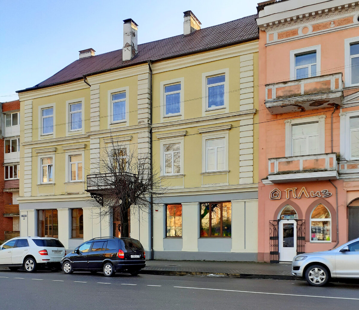 На центральной, но при этом пешеходной улице - ул. Победы. И дом выглядит очень даже. На фасаде даже рустовка сохранилась. А какой замечательный отреставрированный балкончик с кронштейнами над входом в "Чиполлоне"!