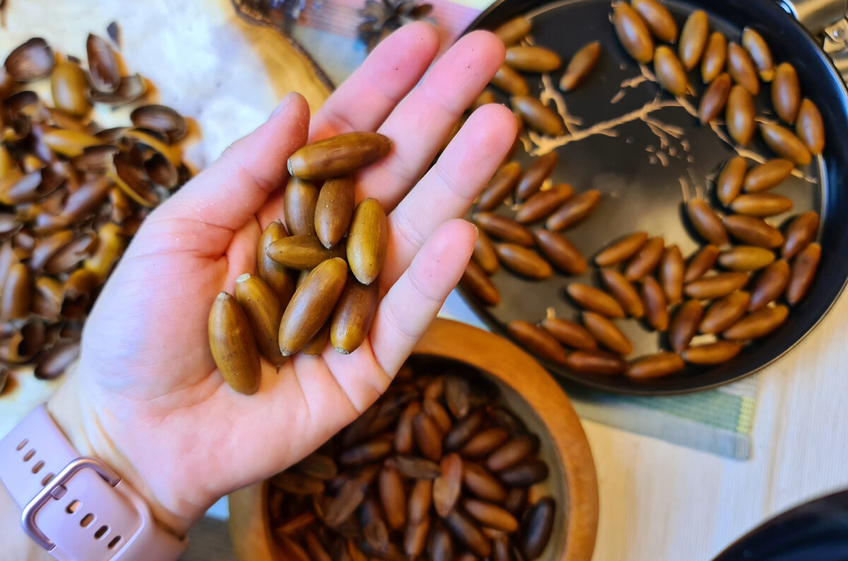 Знали ли вы, что желуди можно есть? Наверняка знали. А вот как именно их можно съесть, как собирать и как заготавливать - знают не все. Мне дедушка рассказал, что они раньше из желудей готовили и каши, и кофе, и муку для выпечки. Захотелось попробовать. Итак, желуди собирать можно вдали от дорог, в дубравах и парках, главное, чтоб место было чистым. В идеале делать нужно это после первых морозов, тогда они намного меньше горчат. По питательным свойствам желуди сопоставимы с оливками и какао-бобами. В них много белка, жирных кислот (Омега 6,9), рибофлавина, тиамина и ретинола. Лишь одна проблема у желудей - горечь. Даже после морозов они все-таки будут горчить. В деревнях, по словам дедушки, их складывали в сетки и отправляли в реку на 4-6 дней, или же вымачивали в бочках, меняя воду. Делали это прямо в скорлупе. Для того, чтобы очистить желуди - клали их в печь на 10-15 минут. Я воспользовалась духовкой (170 градусов). Теплые желуди легко очистились, наполнив дом сладким, ореховым