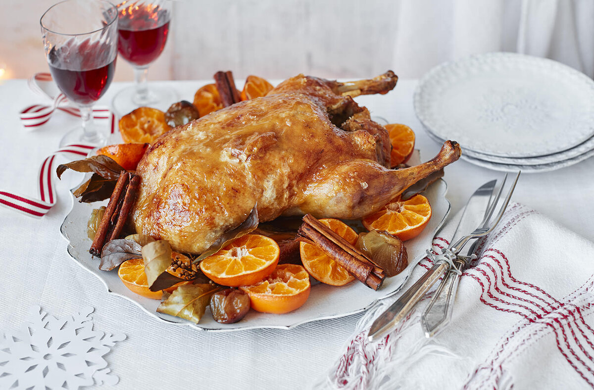 - Запечённая утка с апельсинами и картофельным гарниром готова.