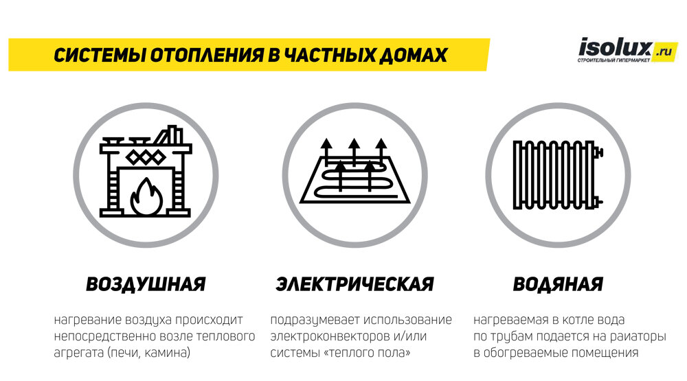 Для частных домов без центрального отопления существуют различные варианты отопительных систем. Они делятся на три основных типа: водяное отопление, воздушное отопление, электрическое отопление.
