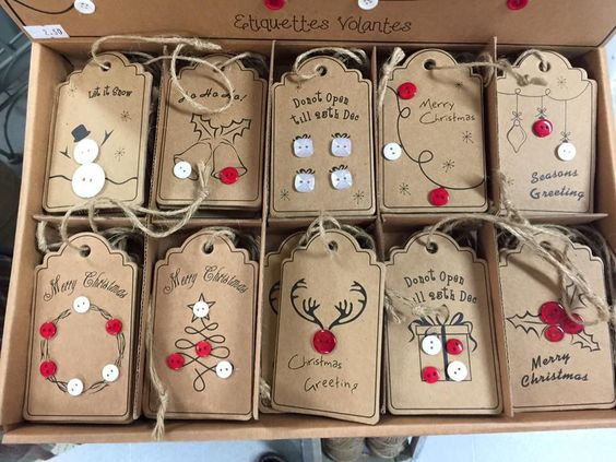 Самый простой способ, не требующий больших затрат, это наличие бирочки. В преддверии Нового года - это бирочки с новогодним сюжетом. Для того, чтобы такие бирочки выглядели аккуратно и не производили впечатления самодельных, лучше всего их изготовить из переплетного картона (продается практически во всех магазинах для рукоделия), после вырезки срезы можно слегка обработать наждачной бумагой. По поводу размеров - они должны соответствовать размерам Вашего подарка. На картон можно наклеить мешковину (можно использовать даже картон для детского труда) и оформить тему пуговицами: Цветная бумага, немного глиттерного фоамирана, полубусины - и перед Вами бирочка с символом в виде Санты или со Снеговиком: Очень мило выглядят подарочные ярлыки в виде оленей, которые не требуют огромных изобразительных талантов, такие оленьи рога может нарисовать даже человек, обладающий минусовыми художественными навыками. Дополняют такие рожки 2 милых глазика и красная полубусина: Еще много вариантов бирочек: