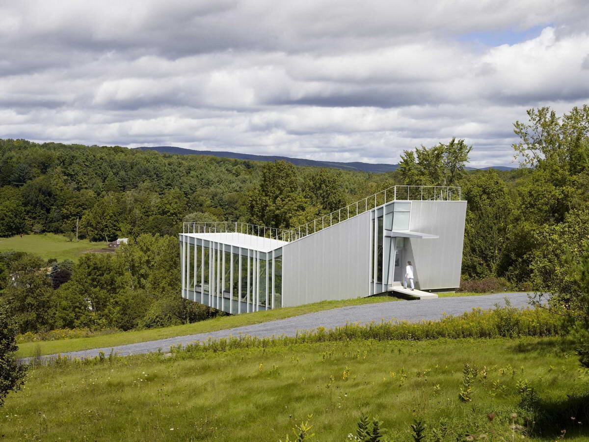 Этот небольшой, но очень необычный дом для загородного отдыха отличается от соседних зданий не только местом расположения, но и своей динамичной архитектурой. Участок доминирует над окружающим лесом, а сам дом сначала спускается по склону, а затем вырывается вперёд эффектной консолью. У дома последовательный план, металлический каркас, панорамное остекление и оболочка из гофрированного анодированного алюминия. Эту дачу архитектор подарил своей жене, скрипачке Бостонского симфонического оркестра. Название: Дом Танглвуд (Tanglewood House)