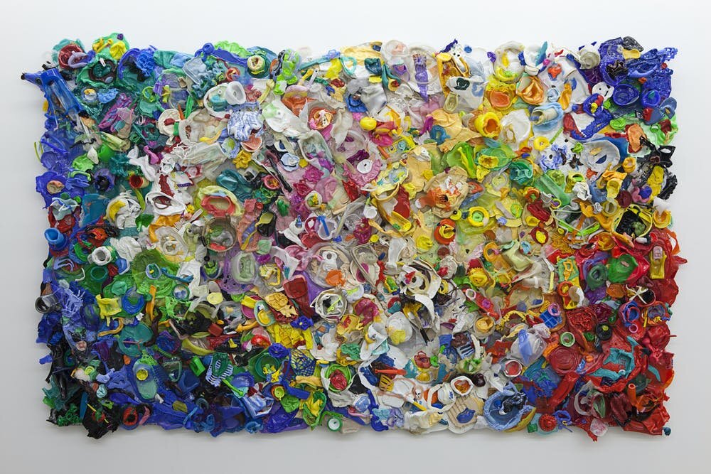 Работа висит на стене, как картина, но состоит из сотен расплавленных пластиковых предметов разных цветов. Марти хочет, чтобы мы думали об этом произведении в традициях живописи, даже если оно состоит из 3D-пластиковых объектов.