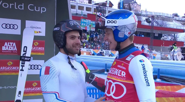 Развязка гонки: Матье Февр – на старте. Француз уходит на дистанцию с запасом в 57 сотых. И уже на первом отрезке теряет его, уходит в красную зону. В Кортине ему хватило нервов для того, чтобы выиграть гонку после схода Пинтуро. Но сегодня обойтись без ошибок не получается, Февр проигрывает 60 сотых, пытается найти правильный ритм, но это не получается, постановка трассы ему не подходит, у него срываются лыжи, и в итоге он лишь 16-й, все проиграл на второй половине трассы (+1.26).