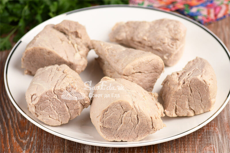7. Отварное мясо нарезаем на не очень тонкие кусочки и добавляем 1/3 часть на овощи.