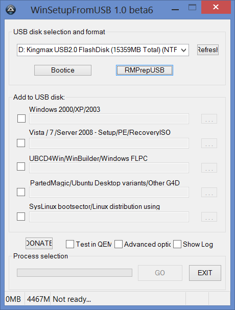 Теперь в окне Bootice следует нажать кнопку «Process MBR». В появившемся окне следует выбрать «GRUB for DOS», после чего нажать «Install/Config». В следующем окне не нужно ничего менять, просто нажмите кнопку «Save to Disk». Готово. Закрываем окно Process MBR и Bootice, возвращаясь к главному окну программы WinDetupFromUSB.