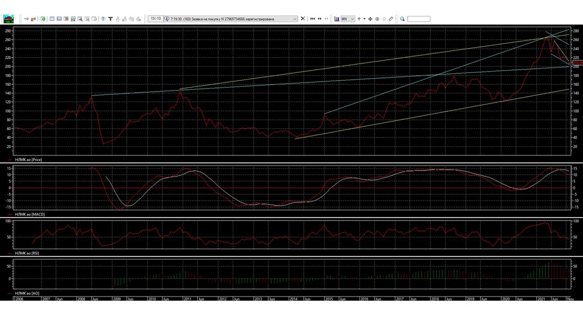 3 декабря компания НЛМК закрыла свой реестр по выплатам дивидендов в размере 13,33 рублей за одну акцию. Очередные выплаты дивидендов компанию собирается провести 25 мая 2022 году планируется выплатить 11 рублей за одну акцию, это пока предварительный прогноз. Закрытие реестра будет 6 мая 2022 году, как видим у нас есть большой временной разрыв, значит есть время положить в свой портфель акции НЛМК. Как показывает технический анализ за это время ожидается просадка, после возвращение с попыткой выйти на уровень 222. В первом квартале 2022 года, вероятно уход акции НЛМК в коридор 145-190, глубина просадки будет зависеть, какие жесткие санкции могут вести против России, американская администрация. В настоящее время ожидается просадка на уровень 170-190 в первом квартале 2022 года, при плохом сценарии можем легко уйти на уровень 145. Начиная с апреля возможно будет улучшаться положение во внешнем мире и внутри страны, появится возможность вернуться на уровень 222, чтобы закрыть дивидендно