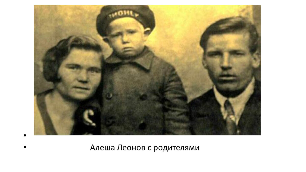 В 1937-м во время уборки урожая зоотехника Леонова поставили заведовать зерносушилкой, он по незнанию не доглядел, и рабочие зерно пересушили. За вредительство Леонова отправили в лагерь, всё имущество конфисковали. Семью выселили из дома, с 3-летнего, ставшего в миг бесправным сына врага народа Алёши сердобольные соседи даже штанишки сняли. Беременная 9-м ребёнком Евдокия Леонова с малыми детьми на руках была обречена на голодную смерть.