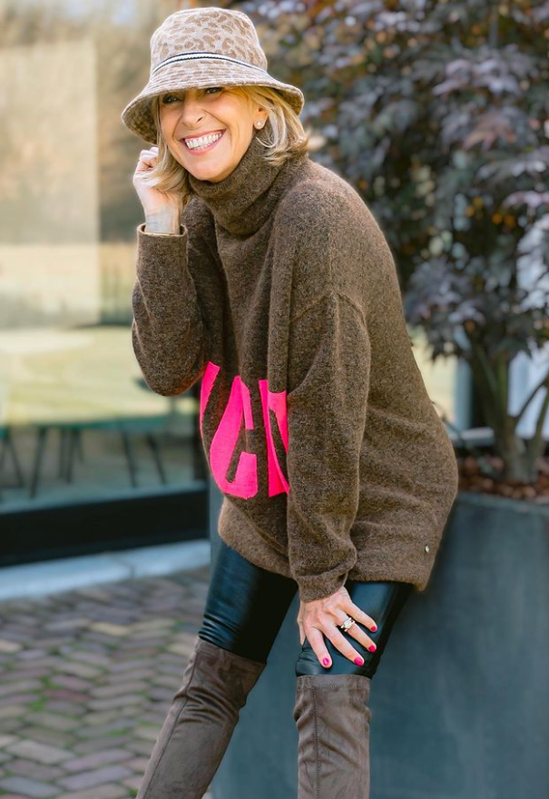 Как же мы не привыкли любить себя, баловать и угождать. Тем, кому сегодня за 60, с детства внушали, что нужно думать прежде всего о других, а потом уже о себе. Но человек, который совершенно не любит себя, чаще всего, не способен дать любовь и другим людям. Поэтому, даже если вы всю жизнь прожили «не для радости, а для совести», срочно меняйте установки и начинайте себя баловать. Одежда, которая вас будет украшать 1. Эффектный комплект с узкими кожаными брюками, удлиненным свитером и ботфортами. Много вы видели женщин возраста 60+, которые одеваются таким образом? Но ведь одежда женщине идет, так почему бы и не выбрать этот достаточно смелый вариант? Образ дополняет модная зимняя панама. 2. Не менее интересный и небанальный образ в бежевых тонах. Брюки укороченные, прямого силуэта, достаточно свободные. К ним подобрали мягкий, уютный свитер с изображением медвежонка , длинное пальто с классическим узором «куриная лапка» и бело-коричневые кроссовки. Стильная деталь – меховая кепка. 3.