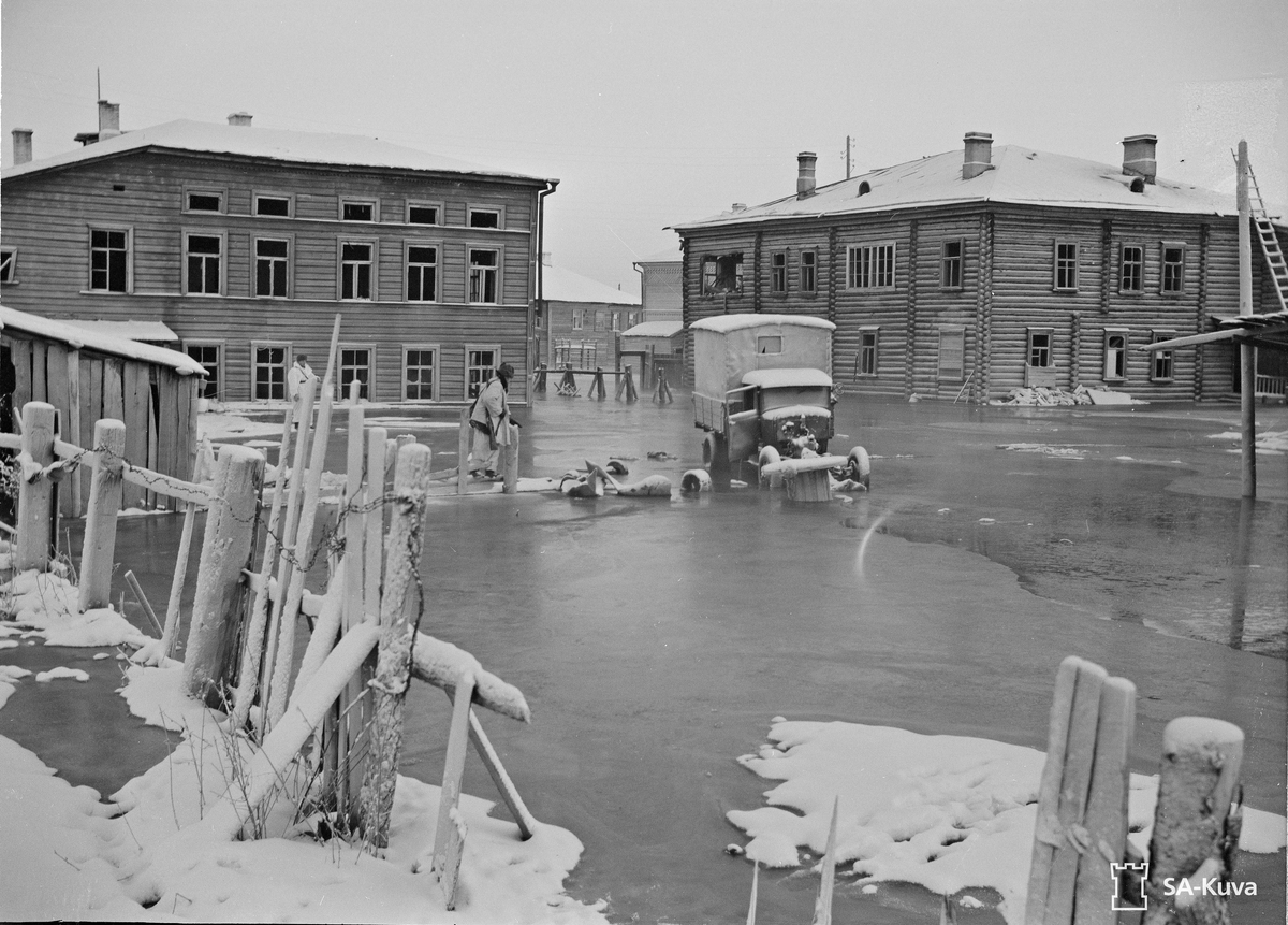 «В 7.00 побудка, суррогат. Опять сильный мороз, примерно 40. Подготовка к отправке в Лумбуши. Танкист Молин сообщил, что поверх льда реки Повенчаики движется поток воды. Через некоторое время опять сообщение; вода поднялась выше, затопила набережную. В 8.00 вода неожиданно резко поднялась, затопив всю восточную часть Повенца. По некоторым улицам бурлил мощный поток, снося в Онего всё, что попадалось на его пути. Машины связистов и сапёров успели проскочить до удара этого потока, они спаслись. Но шедшая следом легковая машина очутилась в воде, некоторое время ее несло потоком, затем ударило об один из столбов и накрыло целиком... Все машины и танки 1-й танковой роты оказались изолированными на небольшом, в половину гектара, участке. Спасения не было ниоткуда. Пытались пробраться на танке, но и его понесло потоком. Вода зажала танк между столбом и углом одного из домов. Экипаж выбрался сначала через люк. потом забрался в дом через окно... Позже пытались перейти и на других танках, и пешком, но не удалось. На берегу реки поток смыл почву, несколько домов обрушилось. А вода все поднималась... Сержанту Сало удалось, наконец, форсировать поток на танке и доставить сообщение о наводнении. Танк младшего сержанта Таковаара ещё раньше застрял в грязи. Когда поток несколько ослаб, вода начала быстро замерзать на сильном морозе, схватывая гусеницы и колёса. Мы попытались соорудить из телег и железнодорожных кроватей какое-то подобие моста, чтобы выйти из ловушки, но не получалось. Тогда решили ещё раз попробовать форсировать поток на машинах. Первой пошла машина со снарядами, она перешла, но шедшая следом грузовая машина "нырнула" передними колёсами в какую-то выбоину, сержант Лампинен, стоявший на подножке, не удержался, упал в сильный поток и утонул. Потом прибыли наши сапёры, начали строить переход для людей через этот поток...»