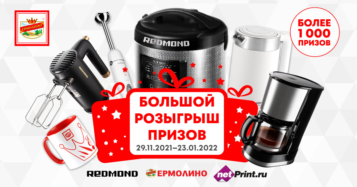 У вас есть шанс выиграть приз в новогодней акции ТМ ЕРМОЛИНО! С 29 ноября 2021 года по 23 января 2022 года мы проводим Большой розыгрыш! Более 1000 призов! Всем участникам гарантированные подарки! Что нужно сделать, чтобы стать участником? Но это еще не всё! Каждые 2 недели мы проводим промежуточные розыгрыши, дарим фирменные кружки ТМ ЕРМОЛИНО и кухонные весы REDMOND. В конце акции вас ждет Главный розыгрыш, в котором мы разыграем бытовую технику REDMOND: Больше чеков – больше шансов на победу! Участвуйте! Без подарков не останетесь! Все подробности акции читайте на сайте