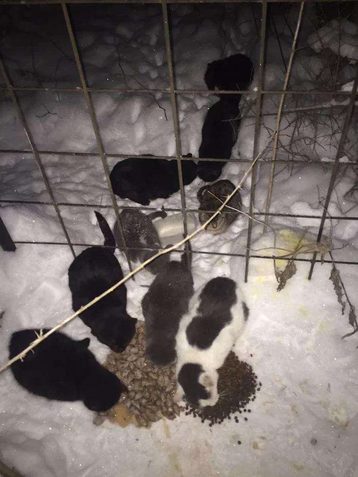 Кормлю брошенных дачниками кошек. 8 декабря (ночь), минус 20. Постараюсь забрать всех котят. Новый котик Батя