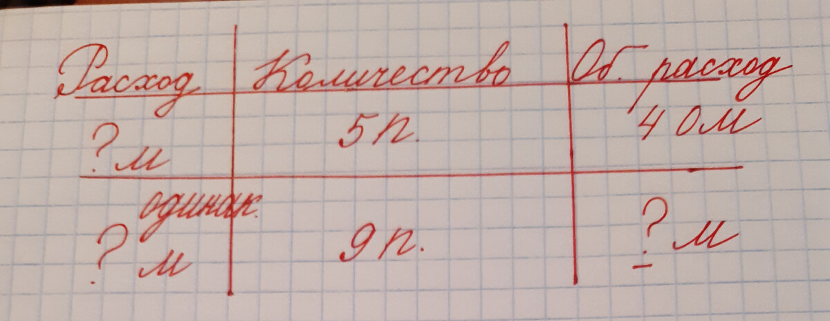 В данной задаче мы уже выполнили первое действие 40:5=8(м)- расход на 1 парник. Мы видим, что в первом столбце можно зачеркнуть вопросы и подписать число 8. Мы переходим к решению с помощью нижней строки. Теперь в ней 2 числа и 1 вопрос. Нам нужно искать, чему равен Общий расход. Закрываем на схеме Общий расход и видим, что для его успешного поиска надо Расход умножить на Количество. Теперь готово и второе действие Обращаю особое внимание: ответ- это просто констатация факта! Достаточно ответить на вопрос "Сколько?" 72 метра. Надеюсь, что мы изображения и инструкции будут полезными для вас, уважаемые собеседники!