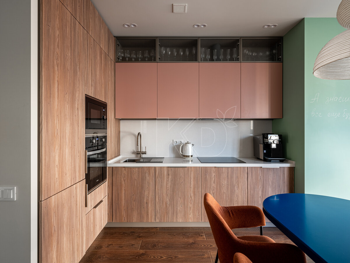Кухня с комбинированными фасадами: розовые и «под дерево»