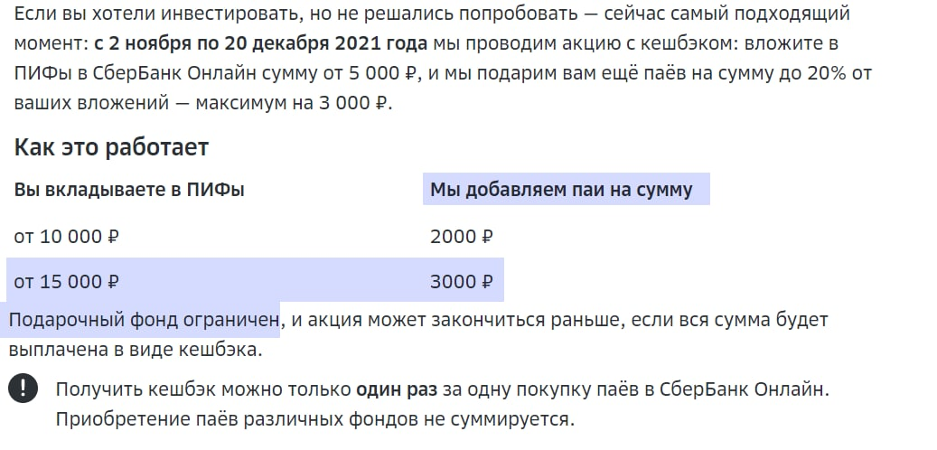 Объясняю подробно, справится даже ребенок. Будет много умных слов, но если дочитать до конца, то поймете что легче и быть не может. Сейчас у Сбербанка (да, пусть не всеми любимый банк), проходит акция на первую покупку покупку Паевых инвестиционных фондов (ПИФов). Акция «Кешбэк за первые инвестиции в паевые инвестиционные фонды» проходит с 02.11.21 по 20.12.2021. В «Сбербанк-Онлайн» в разделе «Инвестиции» покупаете паи от 15 тысяч рублей - получаете паи на сумму 3000 руб. Имеет смысл взять фонд «Сбербанк - Денежный» - минимальный риск и минимальная волатильность, да и покупка/продажа без комиссии. Важные детали: - покупка паёв происходит у вас впервые. - бонусные паи будут зачислены в течение 5 рабочих дней. На баланс паевого фонда придет кэшбек в виде 3000 рублей, после этого можно сразу погасить паи (вывести на карту). С учетом вычета 13% вы получите 2610 рублей чистой прибыли, всего за неделю. Видео инструкция как погасить ПАИ в Сбер: