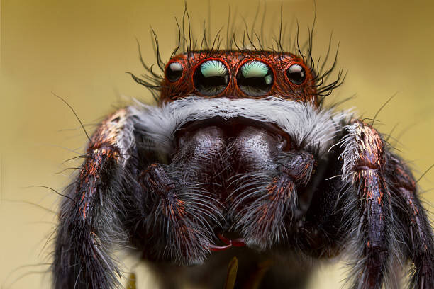 Паук скакун это удивительное создание природы у него отличное зрение, и он абсолютный чемпион по прыжкам, некоторые ученные говорят о задатках интеллекта у этих насекомых. Пауки скакуны представляют особую группу насекомых. Данный вид паука входит в состав отряда пауков и семейство пауков-скакунов. Один из подвидов данного семейства был найден на вершине Эвереста в 1975-х. У паука скакуна достаточно острое зрение,у него 8 глаз расположены в 3 линий, 4 самых больших глаза располагаются на первой линии. Во-втором ряду располагаются 2 глаза среднего размера, в 3 ряду по обеим сторонам головы располагаются еще 2 глаза. Благодаря своим глазам паук скакун может контролировать пространство вокруг себе на 360 гр и тем самым своевременно обеспечивает свою безопасность. Также паук скакун четко различает предметы и определяет цвет. Пауки- скакуны могут обитать практически везде, но предпочитают территории с теплым климатом. Их можно встретить: Характер поведения и образ жизни пауков скакунов с