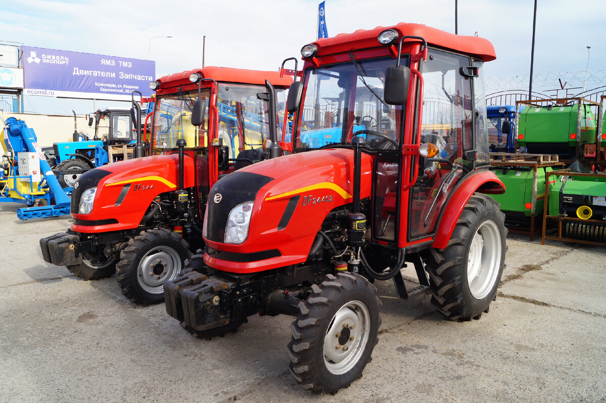 Знакомьтесь! Китайский трактор с кабиной Dongfeng DF-244 G2. Пожалуй, одна из самых востребованных моделей на российском рынке среди поставляемых мини-тракторов из Китая. Зарекомендовал себя хорошо. Даже обзавёлся прозвищем "Дядя фёдор". К дилеру мини-трактора поставляются машина-комплектами. В таком виде они более транспортабельные. Смекалистые наверняка сейчас уловили мысль, самостоятельно заказать трактор из Китая в обход дилера. Думаю, что реально. Однако как это сделать я не знаю. Но если "погуглить" ответ на вопрос найдётся. Собирается трактор в три счёта. Остов и силовой агрегат идут в связке. Нужно прикрутить колёса, собрать и поставить кабину. Ничего сложного! Габариты: длина-3220 мм, ширина - 1360 мм, высота до руля- 1500 мм. Конструктивная масса 1750 кг. Размер заднего колеса 11,2 -24.Размер переднего колеса 6,5-16. Колея регулируется в диапазоне от 1250 мм до 1400 мм. Можно дозаказать дополнительный комплект колёс низкого давления. Получится супер-вездеход. Привод полны