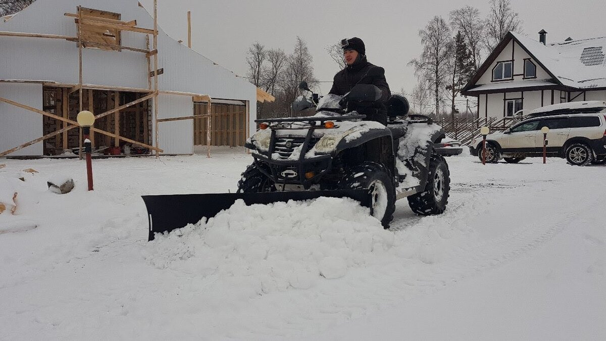 Уборка большого заснеженного участка лопатой или снегоуборщиком отбирает много времени и сил. Гораздо легче убрать снег квадроциклом или мотовездеходом. Всё, что вам нужно для этого — приобрести и установить дополнительное оборудование. Отвал для уборки снега квадроциклом Ширина отвала — 1 500 мм. Для более удобного использования в верхней части конструкции есть ручка. Для быстрой перестановки есть боковые упоры на болтах-барашках. Скользящие ножки регулируют зазор между отвалом и очищаемой поверхностью. Ковш управляется лебёдочным пультом: при подтягивании троса он поднимается, при разматывании — опускается. Угол наклона отвала тоже регулируется. Пружины амортизируют и предотвращают повреждение ковша, резиновая накладка защищает очищаемую поверхность от царапин. Отвал окрашен ударопрочной порошковой краской. Расширители для отвала Если работы много, а на улице мороз, хорошо прогрейте двигатель перед тем, как убирать снег квадроциклом. Подключите полный привод и установите понижающую