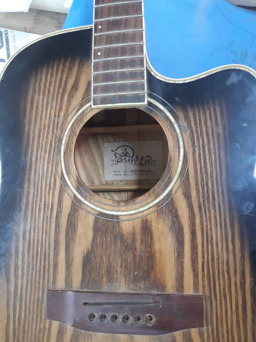 В ремонт поступила полуакустическа гитара Oxen. Поломка очень не приятная - отломилась головка грифа. Причем не в первый раз... До этого были выравнены места прилегания с последующей склейкой, но увы, данная конструкция не выдержала. Так как при переломе края древесины отломились, плюс появилось смещение, то просто приклеить все на место стало не возможным... Для усиления места перелома, ставлю голову на место. Приклеиваю как есть. Точнее на то что осталось. Жду сутки... Пока клей сохнет, привожу в порядок колки. Они все чем-то заляпаны... После чистки... Клей высох. Далее фрезерую пазы в грифе за одно с головкой. В эти пазы вставлю шпонки из клена. Наношу клей и вкладываю шпонки. Прижимаю все это струбциной и оставляю еще на сутки. Далее убираю лишнее со шпонок и предварительно зачищаю. Для дополнительного усиления, спереди приклеиваю декоративную накладку из шпона. Через сутки снимаю струбцину. Ставлю колки и новый порожек. Далее полирую лады, чищу накладку грифа и пропитываю её л