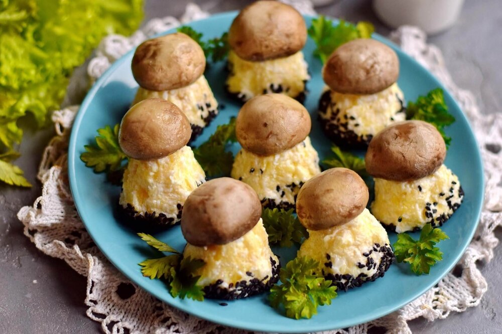 Данная закуска это некая интерпретации салата «Грибная поляна». Подается она в виде небольших порционных грибочков, что смотрится очень оригинально и аппетитно. Ножки грибков готовим из мягкой сырно-картофельной массы, сверху которой устанавливаются шляпки маринованных шампиньонов. Эти компоненты великолепно дополняю друг друга, делая блюдо очень вкусным. Ингредиенты: Приготовление: Картофель отварите в кожуре до готовности, после остудите и очистите. Натрите картофель на мелкой терке. Яйца сварите «вкрутую», охладите, очистите, аккуратно отделите белки от желтков. Желтки не понадобятся в этом блюде. Белки натрите на мелкой терке, добавьте к картофельной стружке. Твердый сыр также натрите на терке с мелкими зубцами, поместите в основной состав. Мягкий сыр фета измельчите вилкой в мелкую крошку, добавьте к другим компонентам. Смесь заправьте майонезом, добавьте измельченный чеснок, посолите по вкусу, тщательно перемешайте, соединяя все ингредиенты между собой. От основной массы отделите