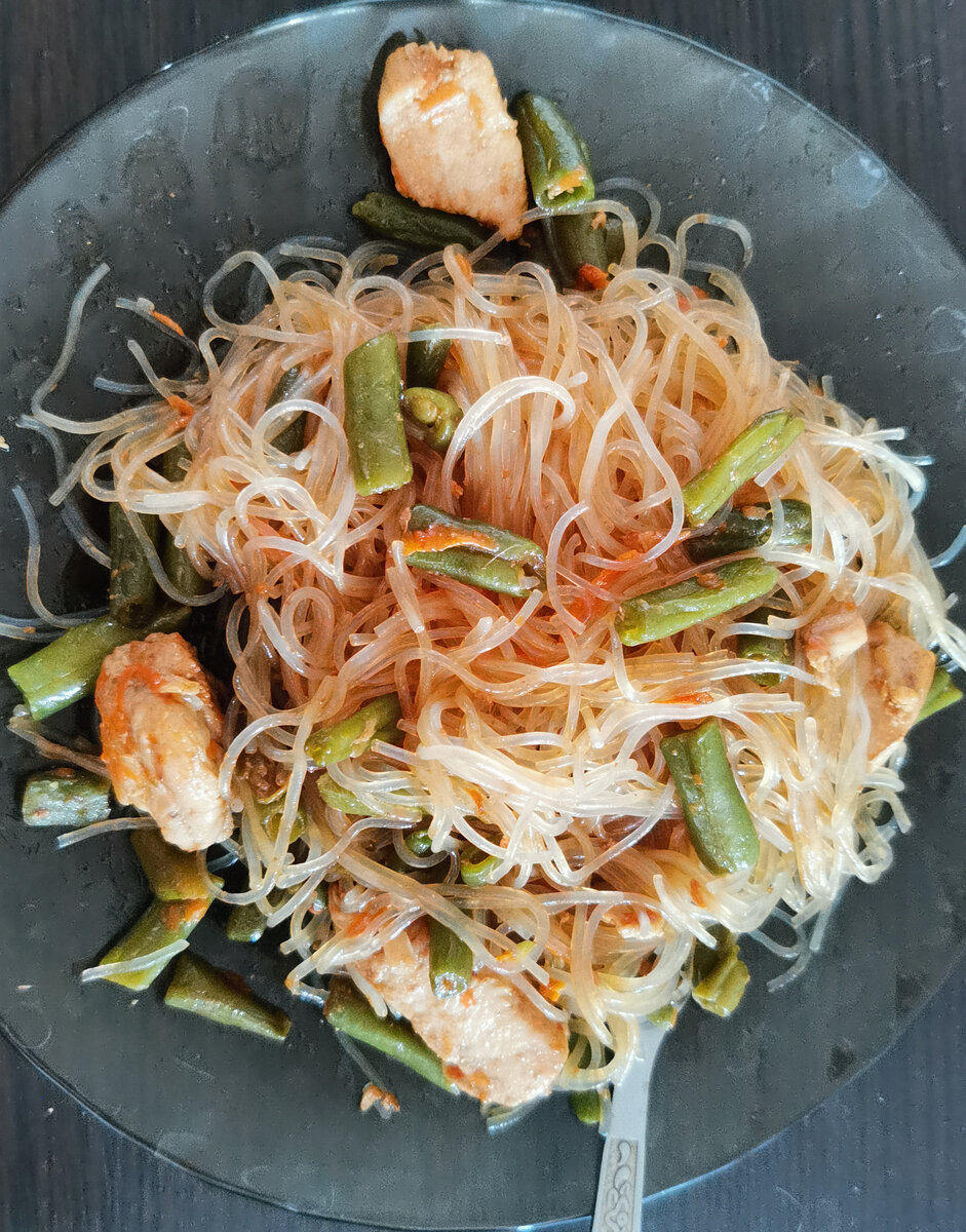 Сегодня захотелось приготовить фунчозу с овощами и курицей для этого нам потребуется ингредиенты : Способ приготовления : 200 граммов куриной грудки нарезаем кусочками,в сковороде разогреваем пару столовых ложек масла и на сильном огне быстро (не более 2-3 минут) обжариваем измельченную куриную грудку. Важно, чтобы мясо именно покрылось аппетитной корочкой, при этому внутри осталось сочным.Следущий шаг добавляем фасоль и морковь чеснок и обжариваем ещё пару минут. Приготовление фунчозы для этого сухую фунчозу выложите в глубокую миску или кастрюлю и залейте крутым кипятком так, чтобы уровень воды был выше этой самой лапши. Прикройте крышкой и оставьте минут на 5-6, чтобы фунчоза распарилась и стала прозрачной. После слейте воду через дуршлаг и промойте холодной водой. Завершающий шаг выложите фунчозу в сковороду к овощам с курицей добавьте соевый соус и потушить 5мин. Приятного аппетита!!!