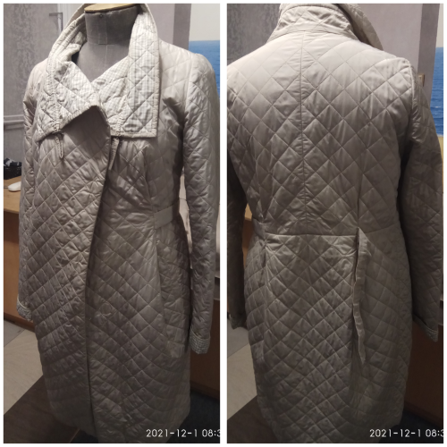 Про идею: Для начала убрала поясок и освободила складки. Дышать стало легче 😉 и появился нужный овальный силуэт. Думала, что обойдусь частичной переделкой. Сделаю центральную застёжку. Отведённый борт срежу. Уменьшу ширину стойки. Нужный силуэт это хорошо, ну не тут-то было. :-)