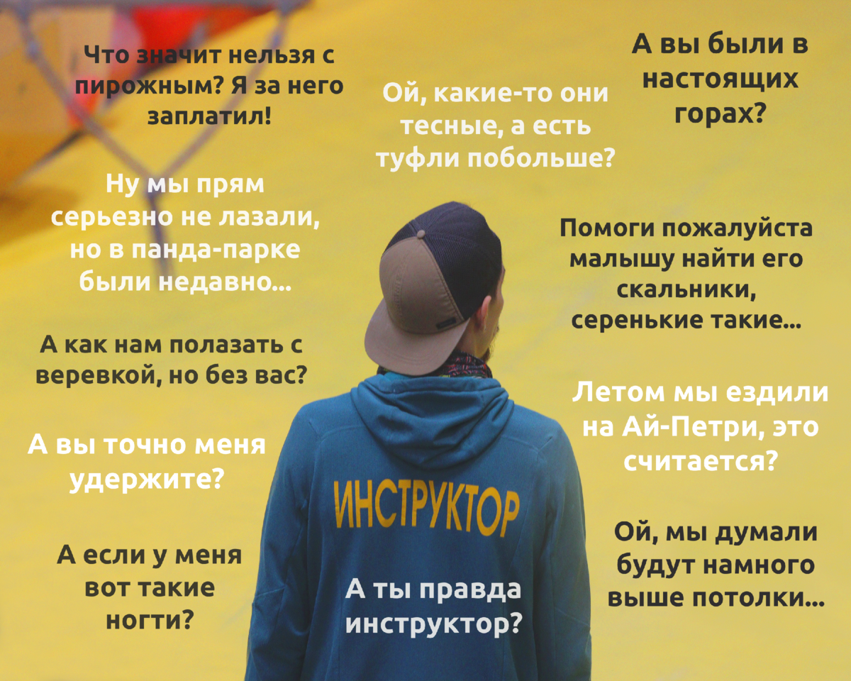 Многие из вас спрашивают, кто этот загадочный человек с надписью «инструктор» на спине, и чем он занимается в свободное от проведения занятия время. И мы расскажем. Не будем вас утомлять выдержками из должностных инструкций и пунктами правил ТБ, а постараемся коротко и ярко описать, что умеет инструктор скалодрома.