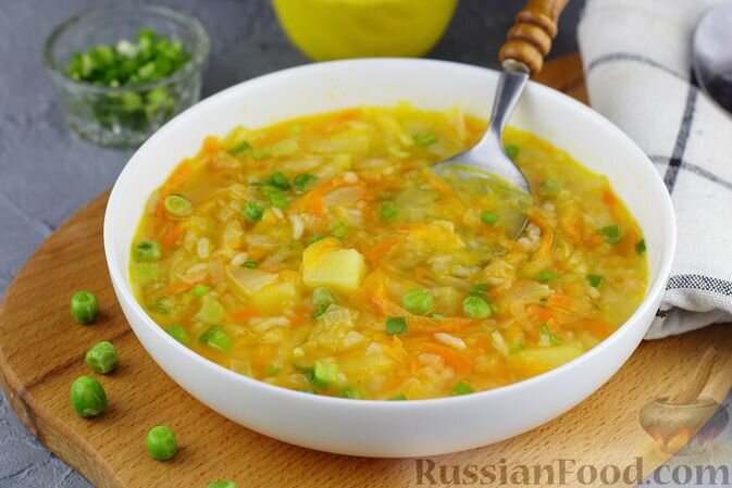 Щи из квашеной капусты с рисом и горошком. Картофельный суп-пюре с сыром. Мясная солянка. Рисовый суп с овощами. Куриный суп с лапшой из лаваша. Рассольник с квашеной капустой. Фасолевый суп с томатным соком. Картофельный суп-пюре с сыром. Суп варится на курином бульоне, но для быстроты приготовления бульон можно заменить водой. В рецепте используются самые простые овощи - картофель, морковь и лук, - но добавление сыра делает блюдо особенно вкусным. Подаётся суп-пюре с обжаренным луком, который выгодно оттеняет нежный вкус супа. Сборная мясная coлянкa - ароматное и очень вкусное первое блюдо, которое можно подать даже на праздничный стол. Солянку готовим на говядине и свинине, с копченым беконом, ветчиной, колбасой и сосисками. Выбираем качественные колбасные изделия и вкусные бочковые огурцы, так как от этих продуктов зависит вкус солянки. Рисовый суп с овощами и сливочным маслом можно приготовить как на мясном бульоне, так и на воде. В этот суп не добавляется зажарка - овощи варятся