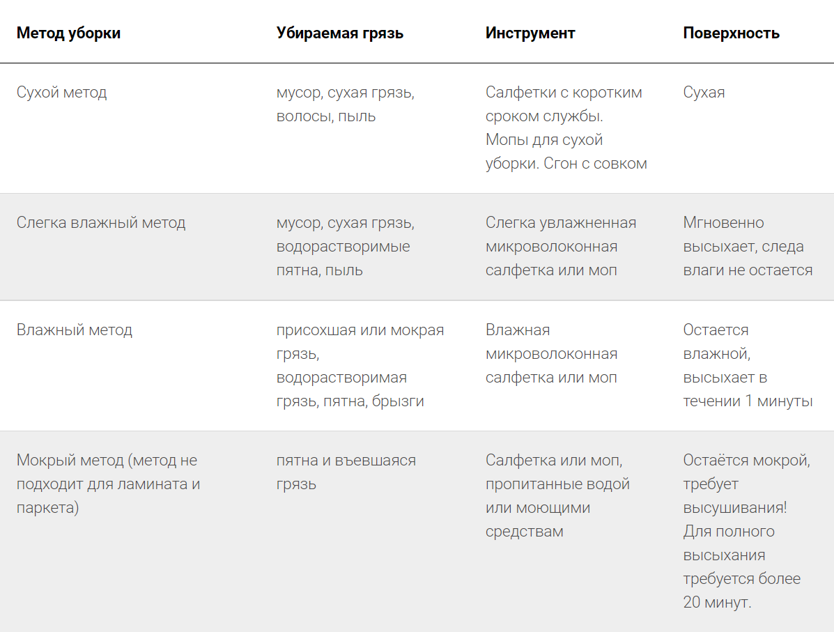 Чтобы этого не произошло, важно соблюдать технологию уборки. По объему используемой воды методы уборки делятся на: Сухой метод Уборка проводится с использованием хлопчатобумажного мопа Vileda и синтетической насадки.Синтетическая насадка притягивает пыль за счет статического электричества при трении, но только при 100% отсутствии влаги!
