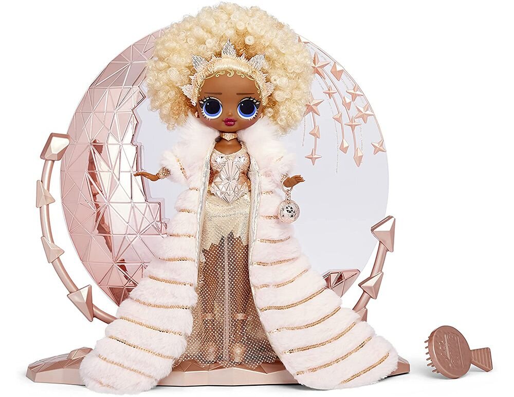 Эта #кукла – самая настоящая королева. У нее темная, красиво оттеняющая волосы и одежду кожа, большие голубые глаза с аккуратным золотым макияжем и блестящая перламутровая помада на губах. Светлые курчавые волосы напоминают воздушную шапку и украшены маленькой короной. Завитушки волос, падающих на лоб и виски дорисованы. Как и все куколки LOL Surprise OMG отличается детализацией и шарнирными частями туловища. Может принимать красивые #позы, у куклы сгибаются руки и ноги. Особенно хочется рассматривать блестящее красивое платье длиной в пол, которое состоит из пластикового топа-корсета с кристальным геометрическим орнаментом и блестящей юбки, сделанной из плотной ткани и полупрозрачной сетки. Образ завершают золотые #туфельки на каблуках и с ремешками. Поверх шикарного наряда накинута люксовая белая шуба из искусственного меха. Шуба сшита из отдельных горизонтальных полос и декорирована золотыми вставками. Рукава шубы также сделаны их #золотистой сетки, которая использована на юбке. Из