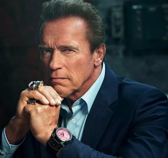Арнольд Шварценеггер играет с друзьями в бильярд. Шварценеггер прицеливается в шар, готовится к удару.