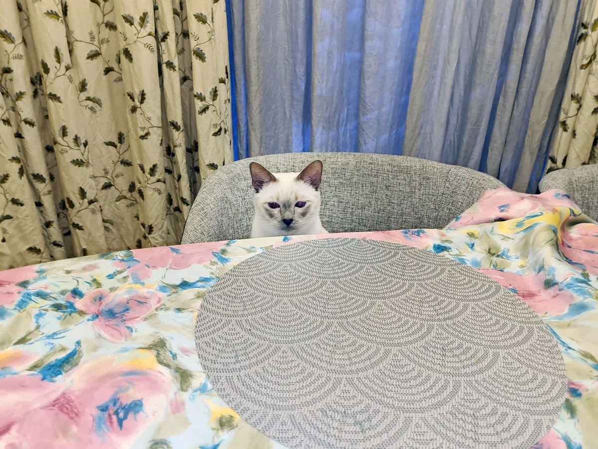 Умеет Митенька давить на совесть и намекать, что хозяйка из меня совсем никудышная. 🙄 Утро уж глубокое, даже на улице светло стало, а стол пустой... Скоро на завтрак спустится Митюшин самый любимый Человек (я про своего товарища-мужа) и его "повозка" (это про Олесю, он любит на ней кататься), а стол не накрыт, яства всякие не расставлены. Непорядок!!! Меня поражает как же Митя умеет своей мимикой владеть и выражать НЕУДОВОЛЬСТВИЕ от происходящего. Пришлось как-то сгладить вопиющее (завтрак был ещё не готов) и предложить Мите единственное, что было в "готовом виде". Митюша всё равно не оценил. Был суров и серьёзен. 😼