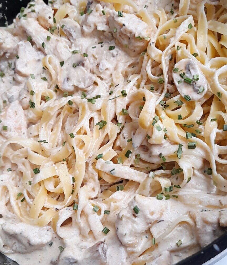 》 В большой сковороде на сильном огне добавьте немного масла и обжарьте курицу до золотистого цвета, затем добавьте грибы, перец и розмарин. Перемешать и варить 5 минут. Затем влить сливки и убавить огонь до минимума.