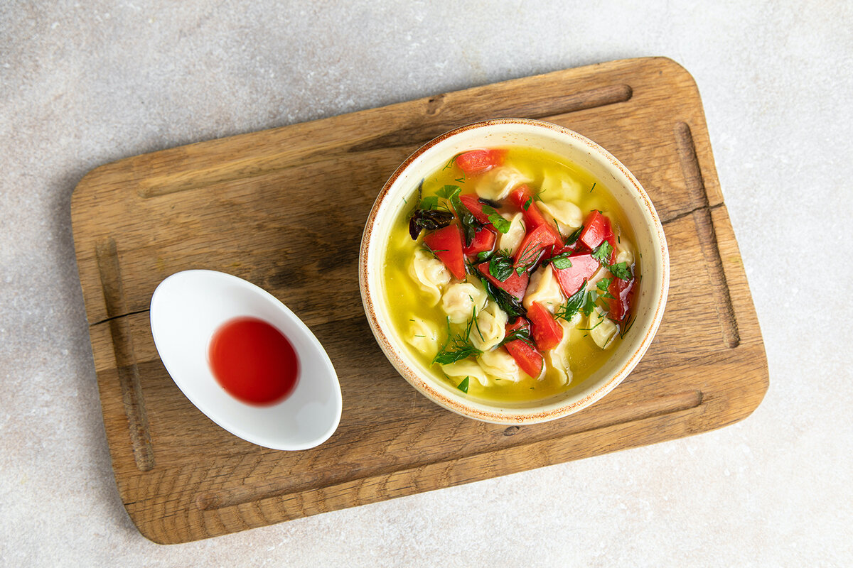 От шеф-повара ресторана Shore House Виталия Кима Ингредиенты (на 1 порцию): Для приготовления: Дюшбара (на 1 кг): Тесто (на 550 г): Фарш из цесарки (на 1 кг): Бульон из цесарки: Способ приготовления: 1) Приготовить фарш: мясо с луком пропустить через мясорубку, добавить соль и перец, тщательно вымесить. 2) Приготовить тесто: смешать муку и воду и как следует вымесить до однородной консистенции. 3) Тесто нарезать на квадратики, в центр каждого квадратика выложить фарш и слепить в виде маленьких пельменей. Готовую дюшбару выложить в сито и слегка встряхнуть, освобождая от лишней муки. 4) Подготовленную дюшбару отварить в кипящем бульоне с добавлением помидор. 5) При подаче в тарелку налить бульон, выложить готовую дюшбару и добавить зелень. Отдельно подать домашний уксус.