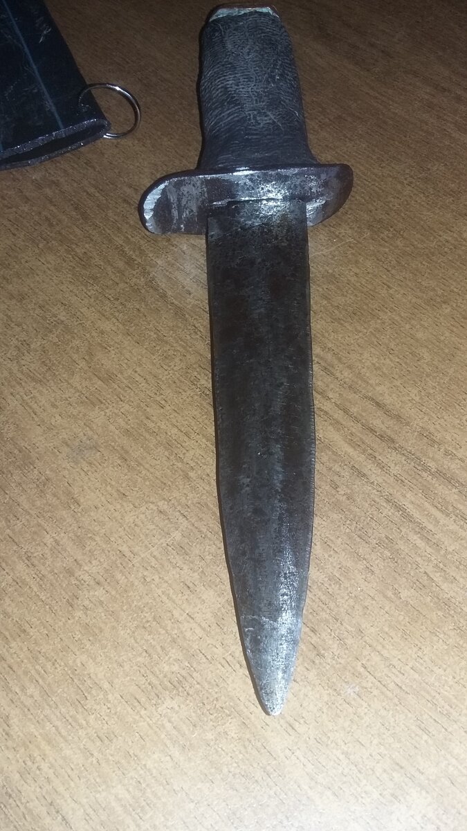 В 1981 году мне было 8 лет, когда борясь с братом в нашем свежевспаханном огороде одного из дворов посёлка "Путь Ленина"(всегда и по ныне уральская деревня "ВОДОПОЙКА") мне в руку из земли сам влез этот старинный клинок, естественно без рукоятки и довольно ржавый. В горячах я тогда чуть не ткнул брата этим артефактом. :( Парой минут позже мы с братом упрямо пытались при помощи метания воткнуть найденный клинок в не вчём не виноватое дерево, чем и привлекли внимание гостившего у нас деда. Дед бывалый фронтовик, взял находку посмотреть и не вернул. Мы повозмущавшись и успешно забыли про клинок почти на четыре десятка лет. Конечно мои детские воспоминания иногда возвращали меня на протяжении жизненного пути к той давней и интересной случайной находке в свежевспаханном уральском черноземье. Спустя десятилетия после смерти деда, а затем после пожара в его доме, среди унылого пожарища я обнаружил старого знакомого в компании старых и довольно свежих банок из под краски. Дедушка похо