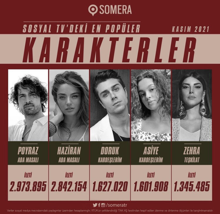 портал Somera каждый месяц подводит итоги, составляя рейтинг из пятёрки как самых популярных персонажей, так и самых популярных пар. И поскольку о самых популярных парах мы уже говорили, сегодня мы обсудим пять самых популярных персонажей месяца, согласно упоминаемости в соцсетях. Не скажу, что данный рейтинг сильно отличается от рейтинга пар. Тут на пятом месте Зехра из «Разведки». Недавно я читала о том, как Дениз Байсал рассказывала о своём персонаже, то, какая Зехра на ее взгляд. Она считает её очень умной, с чем и я согласна. Чуть выше Асийе. Но по упоминаемости у них с Зехрой большой разрыв. Асийе – одна из главных героинь сериала «Мои братья и сёстры». Очень милая и добрая девушка. На третьем месте Дорук, возлюбленный Асийе из «Моих братьев и сестёр». Мне нравится это парень и актёр, его играющий, тоже. У него очень красивые глаза и искренняя, светлая улыбка. На втором месте Хазиран из «Сказки острова». Мне нравится то, как Айча Айшин Туран воплотила в жизнь данную героин