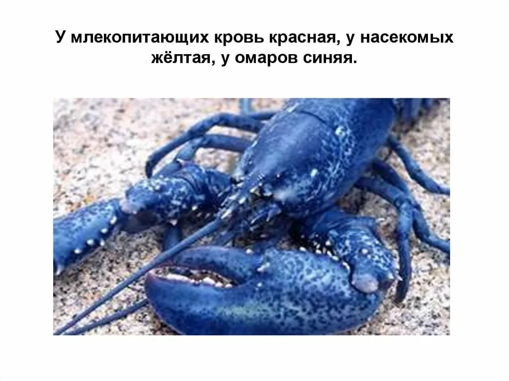 У млекопитающих кровь красная, у насекомых жёлтая, у омаров синяя