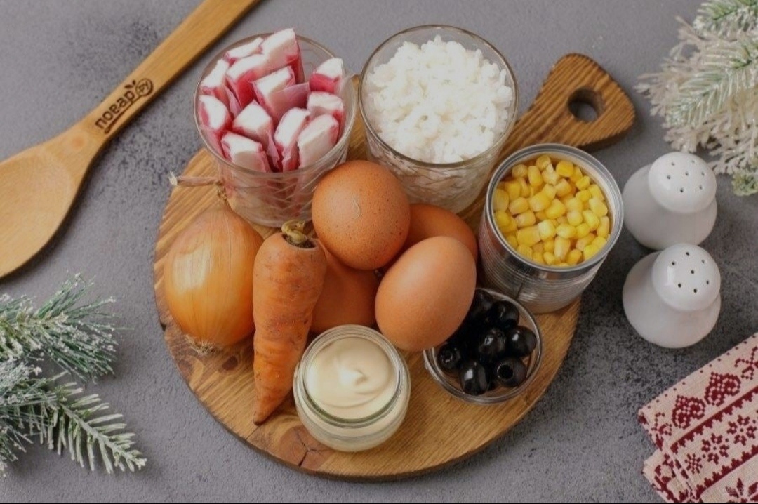 ❄ Салат "Тигр в варежке" с символом будущего года. Несмотря на довольно простой состав, салат получается очень вкусный, а оригинальная подача не оставит его на праздничном столе без внимания. ❄ Приготовить крабовый салат "Тигр в варежке" на Новый год достаточно просто. А вот украсить саму варежку можно так, как позволит фантазия. Аналогично можно приготовить любой салат, куда входят крабовые палочки. Берите рецепт на заметку! Ингредиенты: ❄ Крабовые палочки — 200 Грамм ❄ Яйцо — 4 Штуки (варёное) ❄ Лук — 1 Штука ❄ Морковь — 1-2 Штук (варёная) ❄ Рис — 4 Ст. ложки (в сухом виде) ❄ Кукуруза консервированная — 1 Банка (маленькая) ❄ Маслины — 5-7 Штук ❄ Майонез — По вкусу ❄ Соль — По вкусу ❄ Перец чёрный молотый — По вкусу Количество порций: 6-8 🎄 Как приготовить "Салат "Тигр в варежке""🎄 Подготовьте все ингредиенты. Заранее отварите яйца и морковь, дайте остыть. Рис промойте и отварите в подсоленной воде до готовности, затем откиньте на сито и снова промойте.