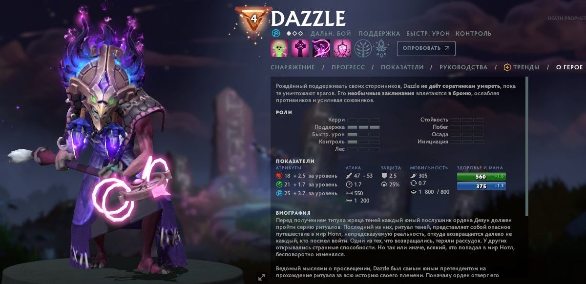 Один из лучших саппортов в Dota 2, занимающий 37 место по количеству сыгранных матчей за месяц. Основная особенность Даззла заключается в его 2 скилле. Он накладывает на него или его союзников крест, который не дает умереть в течение действия данного бафа. Таким образом, можно легко сейвить тимейтов и тем самым выигрывать важные драки, что в итоге приводит к победе в матче.
