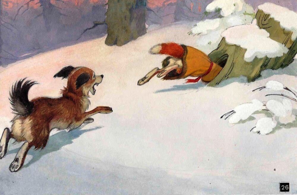 Однажды лисе повезло оторваться от погони (своры собак). Нет чтоб сидеть в норе и радоваться, выравнивать дыхание. Но стресс спровоцировал обострение шизофрении. Лиса зачем-то стала опрашивать разные части тела, какой вклад они внесли в победу. Налицо классическое расслоение психики. Так было бы у людей. У диких зверей не бывает даже неврозов. Когда не оценивают работу в команде Лиса на полном серьёзе вступила в разговор с лапами и ушами. И ей они на полном серьёзе отвечали. — Ушки, ушки, что вы делали? — Мы слушали да слушали, чтобы собаки лисоньку не скушали. — Ножки, ножки, что вы делали? — Мы бежали да бежали, чтоб собаки лисоньку не поймали. — Глазки, глазки, что вы делали? — Мы смотрели да смотрели, чтоб собаки лисоньку не съели. — А ты, хвост, что делал? — Я по пням, по кустам, по колодам зацеплялся. Нет. Такой ответ не нравится лисе. И мгновенно она из дознавателя и следователя превратилась во власть судебную - обвинила хвостик в халтуре. Следом вдруг стала властью исп