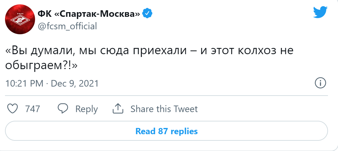 Несмотря на хорошую игру на выезде против "Легии", "гладиаторам" все же подфортило, так как статистика была не в их пользу, но несмотря на это московский клуб позволяет себе такие твиты на официальной странице клуба.