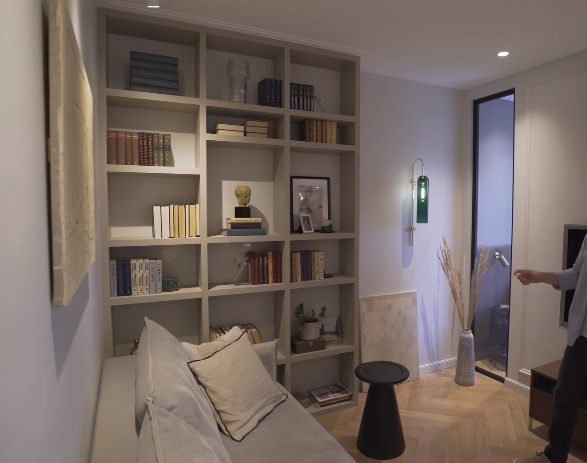 Чтобы не “съедать” ширину общей комнаты, хозяин отказался от навесных шкафов на кухне. Всю утварь он поместил в инсталлированный вертикальный шкаф, а также внутри острова.