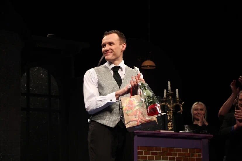 После окончания спектакля большинство творческой труппы вышло на сцену для поздравления героя вечера. Директор Ангелина Шершень торжественно, в присутствии зрителей, вручила ему почетную грамоту комитета культуры Волгоградской области и золотой значок ГТО за сданные нормативы.