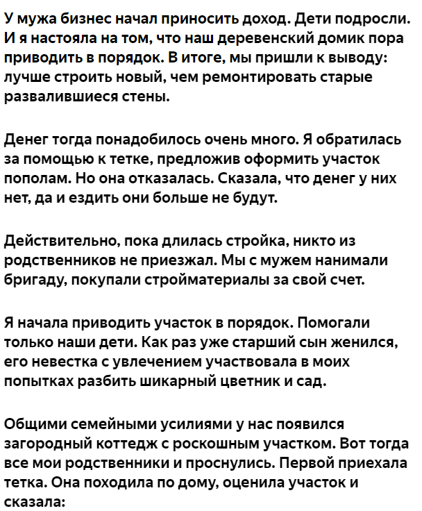 Семья – это самое важное и ценное в жизни. По крайней мере, раньше я считала именно так. Но моя тетка заставила меня многое переосмыслить. И если бы не этот разговор, я бы не знала многого о нас с мужем. Впрочем, обо всем по порядку. Не так давно у меня умерли родители. От них остался домик в деревне. Поначалу я туда не наведывалась, некогда было. Просто траву косили и забывали. Иногда туда приезжали родственники, но тоже ничего не делали – тусовались, в основном. Читать далее (НАЖМИТЕ ЗДЕСЬ)