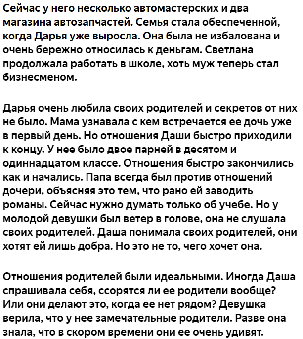 Как и все девушки, Дарья мечтала встретить того самого единственного, который станет носить ее на руках. Она считала, что семья и дети – истинное предназначение женщины. Родители же считались для нее примером вечной любви. Конечно же, ей очень хотелось, чтобы будущий муж был похож на папу. Николай Николаевич был примерным семьянином и трудягой. Всю свою жизнь он, не покладая рук, работал на заводе. Мама педагог была доброй и порядочной женщиной. Когда же завод закрыли, Николаю пришлось переквалифицироваться. Он стал предпринимателем. Удивительно, но бизнес сразу же пошел. Читать далее (НАЖМИТЕ ЗДЕСЬ)