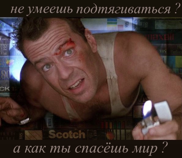 Девяностые .Боевики. Выпивоха с сигаретой спасает заложников . Я смотрел "Крепкого орешка" и мечтал стать таким же крутым мужиком . Когда ребёнок смотрит боевики он не осознает заложенных смыслов и сложную структуру персонажа . Он видит дядьку с босыми ногами и автоматной очередью , бегающего по стеклу . Хотя мой отец тоже вряд ли пытался найти там другой смысл . Поскольку моя мама категорически против алкоголя и сигарет, а отец придерживается противоположной стороны, в четырнадцать лет я попробовал выкурить сигарету и пиво понимая , что это "очень плохо " Первые шаги к герою моего детства сделаны , осталось за малым : устроиться в полицейский участок и развестись с женой . Правда это не главный пазл . Я не умел подтягиваться ! Я играл в футбол, катался на скейте, плавал, мог пройти десятки километров, даже гуськом .Но повиснув над пропастью, вряд ли спас мир . Максимум кричал бы : Ааааааааааа , ПОМОГИТЕ ! Турники стояли в каждом дворе и окна домов были обращены на них . Есте