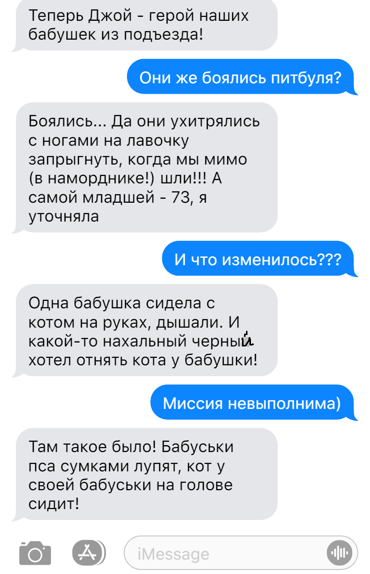Мы живем рядом с собаками (чаще всего) с самого детства. И всё равно они всю жизнь нас удивляют... Так вот, также с детства нас окружают люди намного старше нас. И несмотря ни на что, они нас тоже иногда удивляют. При всем моем уважении, старушки (прямо совсем старушки) - это отдельный вид людей, со своими удивительными размышлениями и поступками. А если их еще и с собаками "соединить"... Впрочем, читайте: Вот такой герой - питбуль Джой! И правильно, нечего наших бабулечек обижать! И котов наших не тронь! Сами, если что, погоняем) Еще одна переписка, о паре: очень пожилая женщина плюс хаски. Может быть, я Вам уже о них немножко рассказывала. Этой хаски только 4 года. И только бабушка, с ее терпением, могла научить хаски терпению! Бабушка собаку отпускает, та бегает вокруг нее минут 20, а потом они гуляют "со скоростью бабушки", сидят часами на лавочке, разговаривают. И обе счастливы. Уникальная пара. Хаски очень любит бабушку, полностью подстраивается под нее... Еще одна переписка...