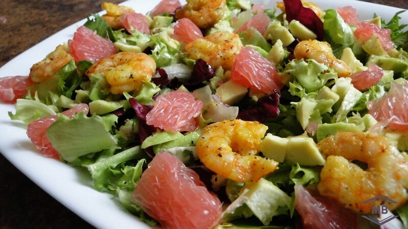 Ингредиенты: 150 грамм креветок, 1 авокадо, 1 перец болгарский, 100 грамм салатной смеси, 1/2 грейпфрута. Заправка: 2 ст.л. лимонного сока, 2 ст.л. оливкового масла, соль и перец — по вкусу.