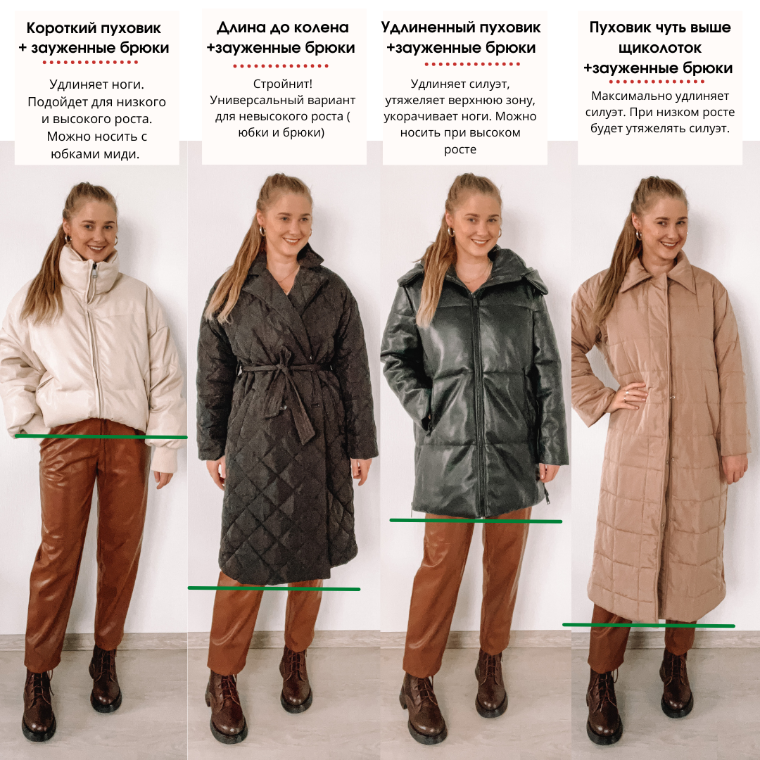 🤔А что насчёт длины? Давайте немного разберём , какую длину пуховика лучше всего выбрать? 🌟Короткий пуховик - для любого роста, удлиняет ноги, может перегрузить верхнюю зону, не рекомендуется грушам или полному яблоку. 🌟Удлинённый пуховик - только для высокого роста и длинных ног. Такая длина пуховика позволяет надевать только брюки, с юбками такая длина не пропорциональна. 🌟Пуховик до колена или чуть ниже колена- хорошая длина для невысокого роста, будет пропорциональна для брюк и юбок, сохранит пропорции. 🌟Пуховик чуть выше щиколоток - подходит для высокого роста, хорошо вытягивает силуэт, но не подойдёт для низкого роста, так как перегрузит силуэт. Такая длина подойдёт для образов с юбками и брюками! Широкие брюки ✅ короткий пуховик 💡Удлиненный пуховик ( утяжелит силуэт) ✅Пуховик до колена( не рекомендуется при низком росте) 💡Длина чуть выше щиколоток ( только для высокого роста) . . Зауженные брюки ✅ короткий пуховик ✅Удлиненный пуховик ( для высокого роста) ✅Пухови